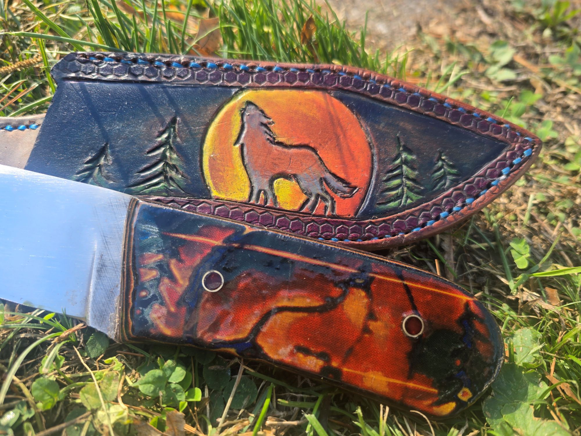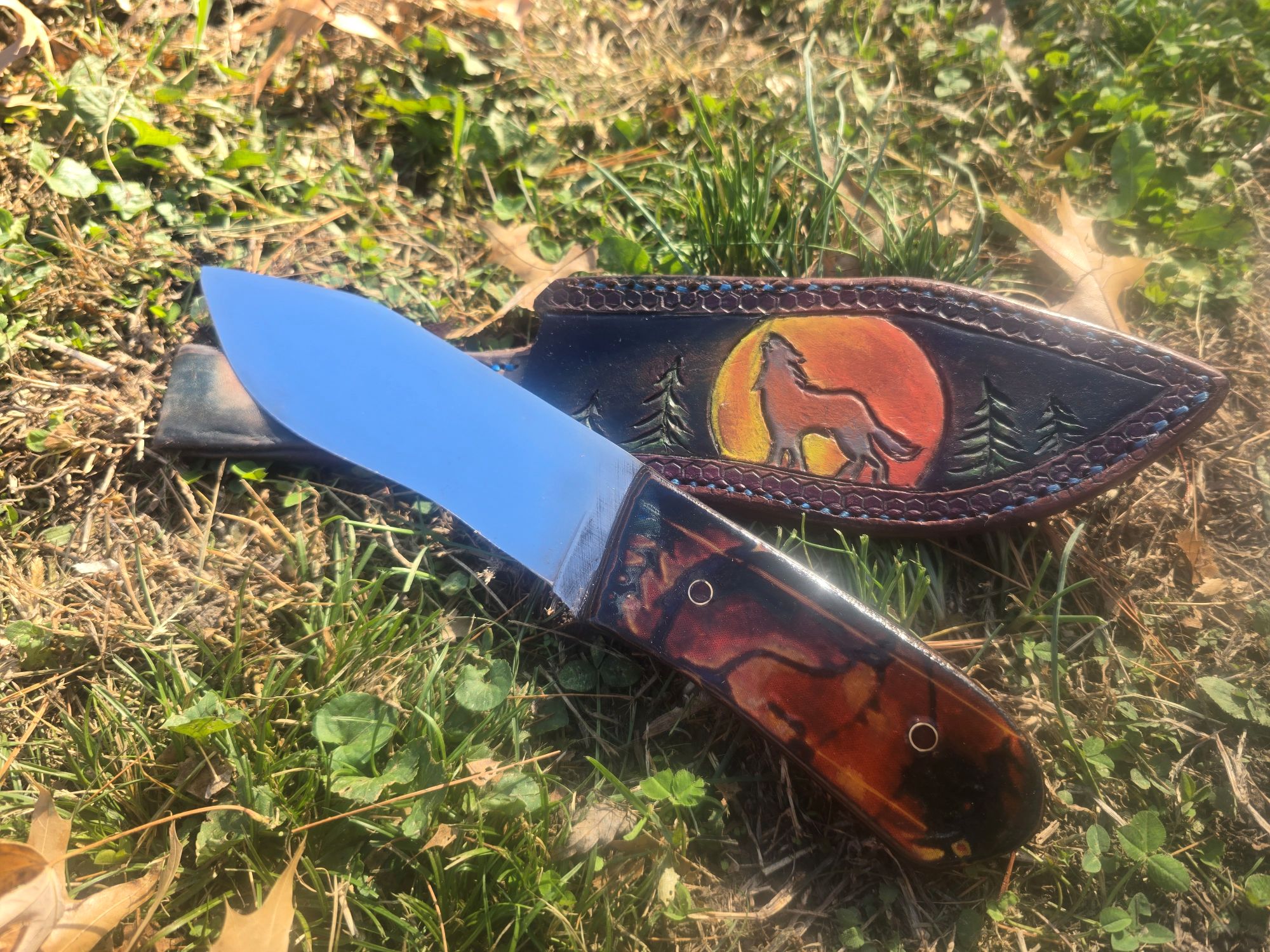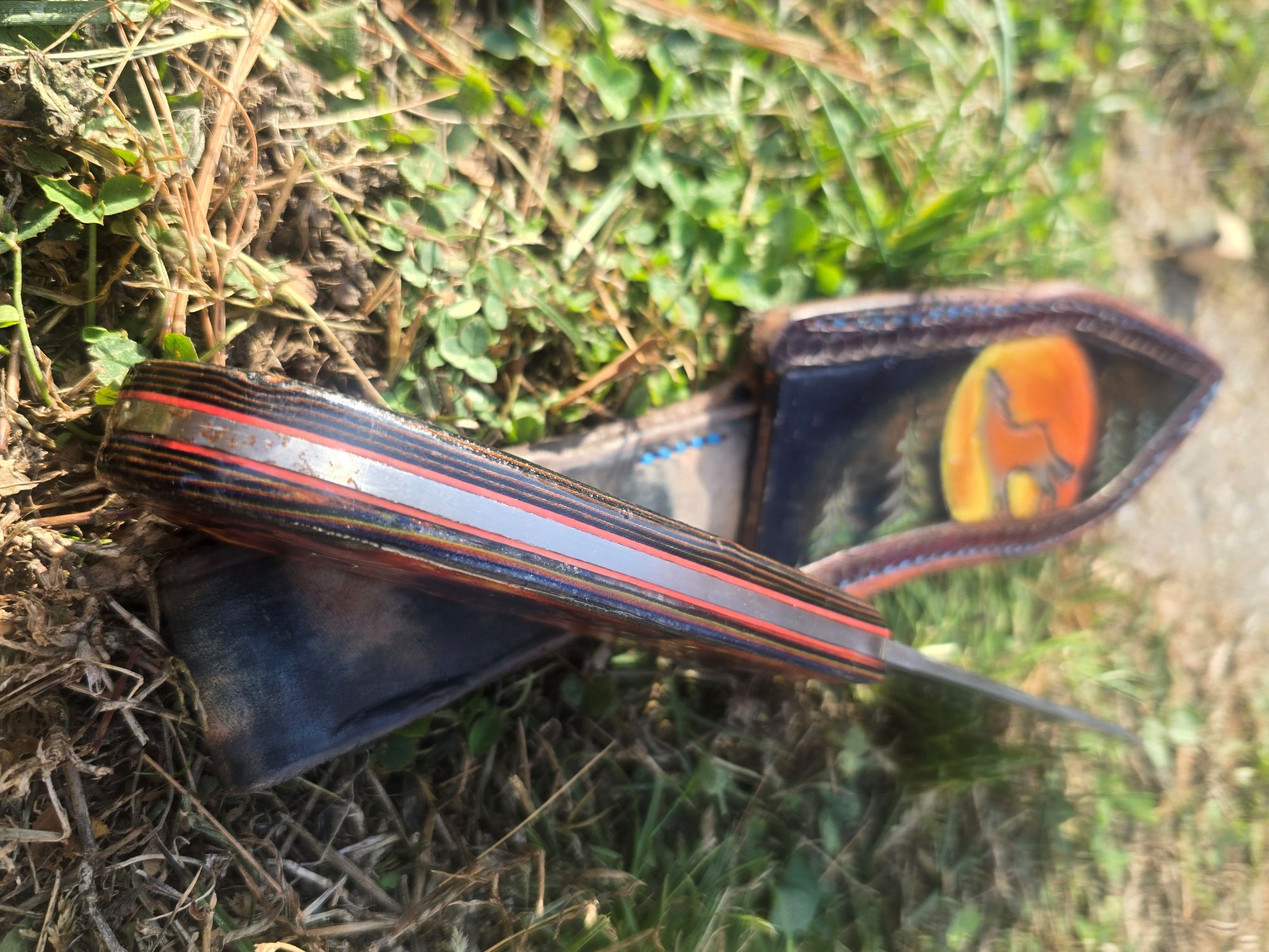 High carbon tool steel blade. The handle is my very own damascus micarta making this a one-of-a-kind useable work of Art. Even though I could recreate these handle scales for sale the colors and pattern itself will be unique. The leather sheath is all handmade. Tooled, dyed, and hand sewn.