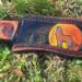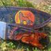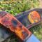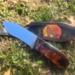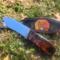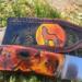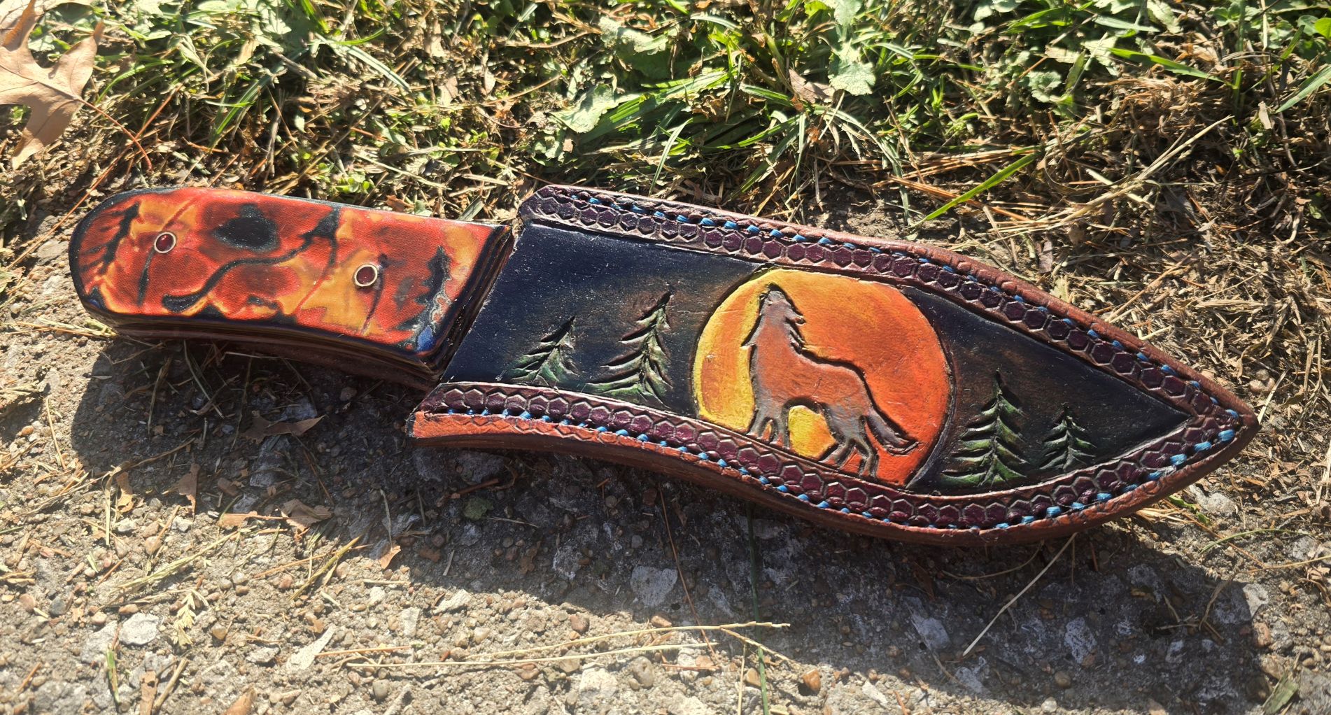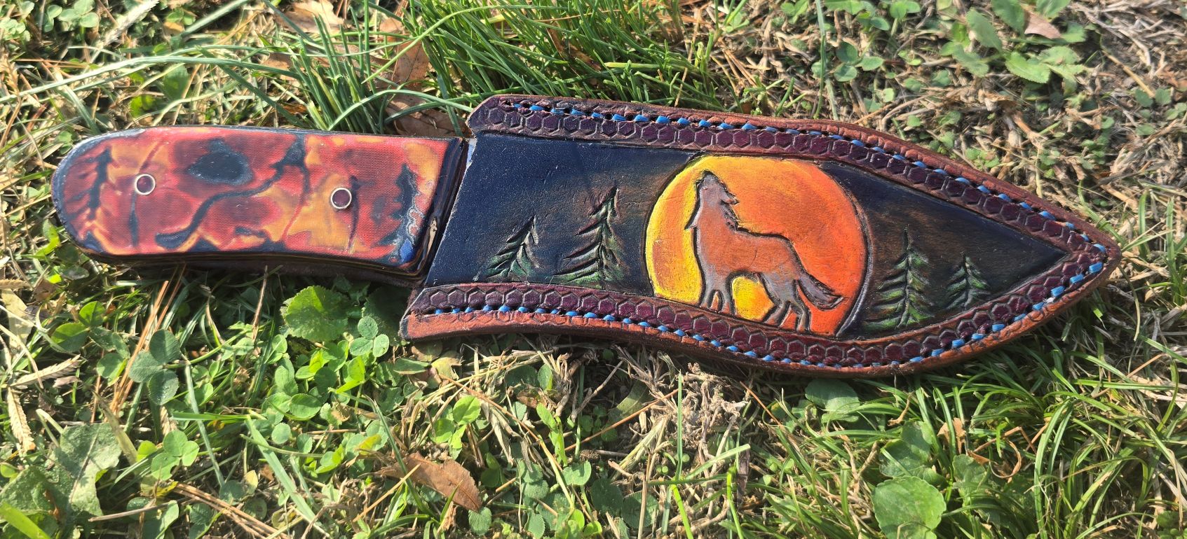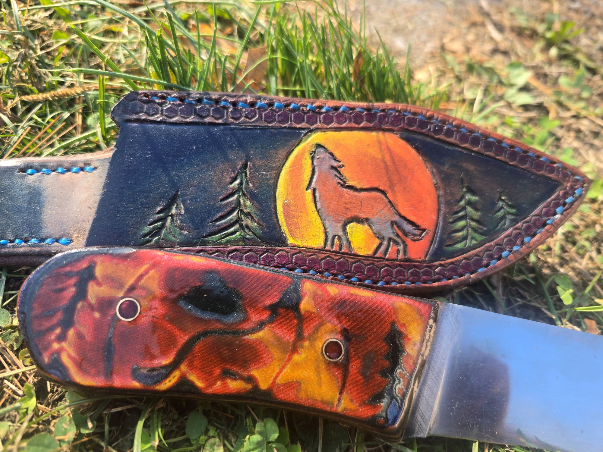 High carbon tool steel blade. The handle is my very own damascus micarta making this a one-of-a-kind useable work of Art. Even though I could recreate these handle scales for sale the colors and pattern itself will be unique. The leather sheath is all handmade. Tooled, dyed, and hand sewn.