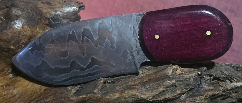 Hand forged pattern welded 1095 and 15N20 high carbon steel. Low layer to give a unique one-of-a-kind pattern. Brass liners and brass pins. The handle is made from the same stabilized purple heart I sell in my shop.